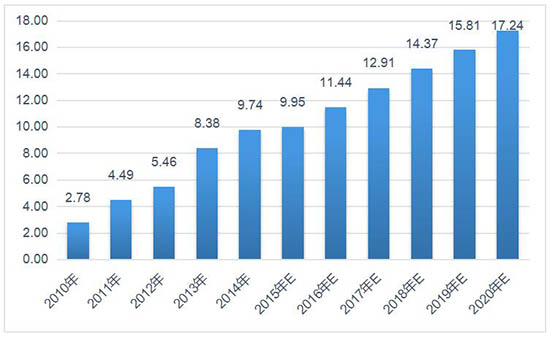 有源滤波设备占据谐波治理市场的主要部分,市场规模也会随着谐波治理市场规模的增长呈现快速增长的趋势。根据协会统计数据显示,有源滤波设备市场规模从2010年的2.78亿元增长到2014年的9.74亿元,年复合增长率达到36.8%。预计到2020年将达到17.24亿元,未来5年的年复合增长率14.73%。