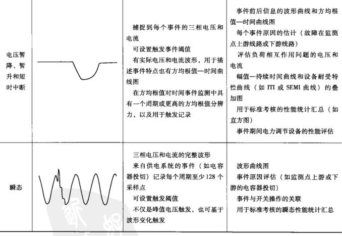电能质量包括了很广的工况和扰动现象。因此,对监测系统提出的要求是很重要的。下表总结了不同类型的电能质量变化所对应的基本要求。